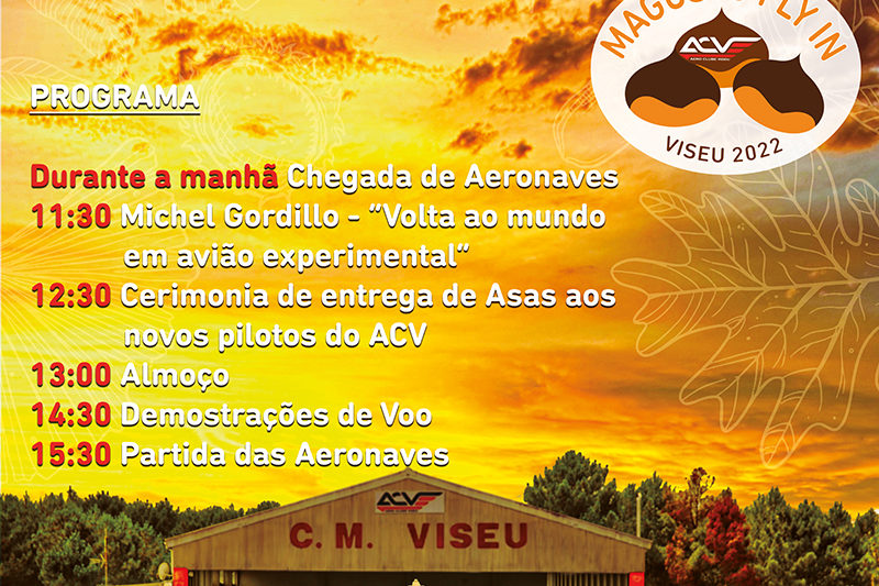 12 DE NOVEMBRO O Aeroclube de Viseu retoma a tradição de bem receber e convida todos os aviadores a participarem num Fly-In / Magusto, a ter lugar no Aeródromo de Viseu (LPVZ) no próximo dia 12 de Novembro. Preparámos um pequeno programa (conforme cartaz em anexo) que irá incluir uma palestra do Cmdt. Michel Gordillo,…